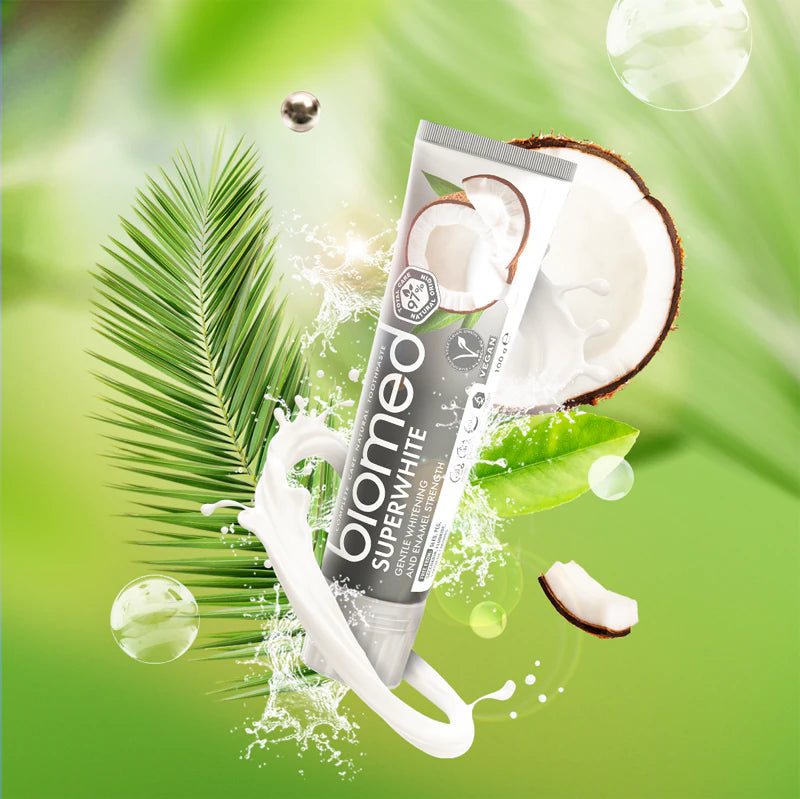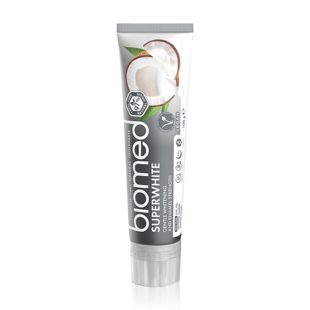 Biomed Superwhite is a naturally derived whitening toothpaste with 97% plant and mineral ingredients. Designed for those looking for a visibly whiter smile without resorting to harsh ingredients, this formula combines the power of coconut oil , pineapple , laminaria seaweed , and natural minerals to gently remove stains, strengthen enamel, and care for gums.